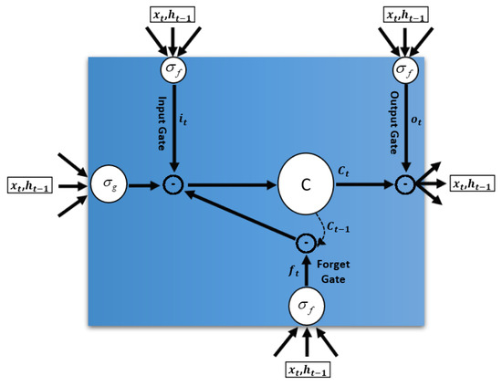 where is the input, the previous states, the previous states within the forget gate, W the weight and b the bias of each inner block of the LSTM, is the activation function, Hedmard multiplication corresponds to pointwise multiplication, and the final output is . The forget gate determines which inputs and previous states affect the output and which should be discarded. This enables the LSTM to learn long-term patterns.
