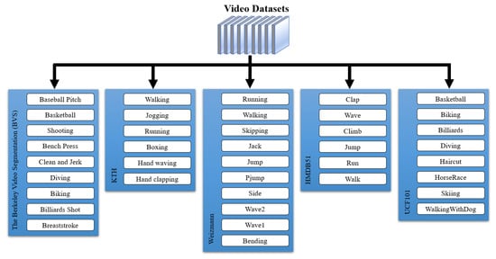 Several action datasets with different conditions are available for evaluating HAR methods. Five datasets were used in this study: BVSD, KTH, Weizmann, HMDB51, and UCF101 datasets, Figure 4. Details of these datasets are given in the following sections.