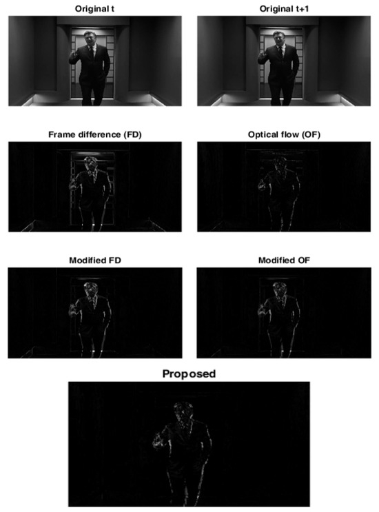 The objective of the temporal processing block is to separate moving objects from the static components of the input video image sequences. There are two types of motions in videos with actions: the motion of objects and the movement of the camera. Usually, in this domain, the motion of objects is associated with action, and camera movement is uninteresting. Consequently, camera movement should be removed to ensure that the feature extraction is not affected; therefore, the temporal block consists of camera movement cancellation, optical flow, and frame difference sub-blocks. Regarding the priority, first, camera movement should be cancelled, and then, optical flow and frame difference should be calculated.