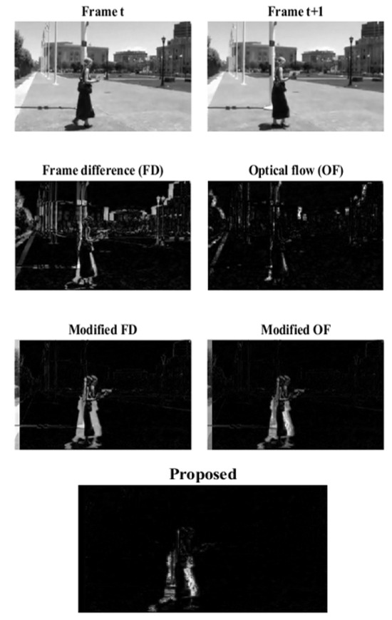 In our method, static and moving objects were separated by comparing the flow angles. Static objects, as the main part of an image frame, have similar flow angles due to camera movement, and moving objects have different flow angles. A cluster containing many similar or denser components is considered to contain camera movement, while the remaining clusters represent object motion. The camera movement in the horizontal and vertical directions is determined according to the angle and intensity of the optical flow in the centre of the denser cluster. Subsequently, all flow vectors are adjusted according to the camera movement. In this way, the static components of the scene that previously had a motion vector due to the camera movement become static. Moreover, it is not necessary to recalculate the optical flow, and the flow results can be corrected by subtracting the centre of the denser cluster from all flows. In the next step, the frame difference is calculated based on the corrected frames. After the camera movement cancellation, the image optical flow and frame difference provide a more accurate representation of the object’s motion. In cases where the dataset is acquired with a static camera, this step is unnecessary and can be discarded.