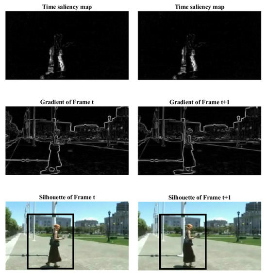 In the current study, silhouette extraction is performed by assuming that the background contains motionless regions or is far from the motion region. First, the gradient of the image frame is calculated using the Sobel operator. It is assumed that the silhouette region is rectangular and contains motion, as well as parts that overlap with the motion region. This includes the entire body, i.e., incorporating both moving and non-moving parts, to differentiate between human actions accurately. The maximum dimension of the rectangular window for the silhouette image is assumed to be times the salient region specified in the temporal processing block. As the motion region has already been identified in the preceding steps, the silhouette extraction is more accurate and faster than the general methods.