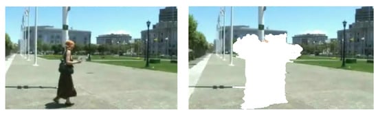The KTH Dataset contains 600 video image sequences of six different actions [100]. There are a total of 2391 frames in the videos, all acquired in black and white at a resolution of , and only one person is seen in each video. The actions included in this dataset are walking, jogging, running, boxing, hand waving, and hand clapping. The videos were acquired from a fixed distance, and the person’s body is fully visible in them, and the angle and direction of the scene are fixed. However, in some cases, the human scale changes. The clothing of the people in the scene also changes. Because the camera angle and scene are fixed, and there are no sudden changes in the scene or background, and therefore no shot detection or camera movement cancellation is required for this dataset. It has been considered a good benchmark in many studies [101,102,103,104]. The low resolution of the videos also reduces the required computations.