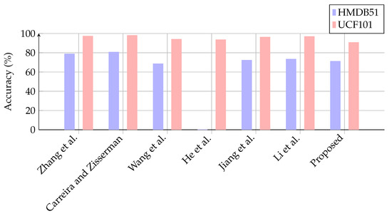 - Kuehne, H.; Jhuang, H.; Garrote, E.; Poggio, T.; Serre, T. HMDB: A large video database for human motion recognition. In Proceedings of the 2011 International Conference on Computer Vision, Barcelona, Spain, 6–13 November 2011; pp. 2556–2563. [Google Scholar] [CrossRef]