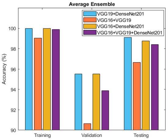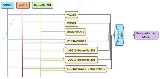 - Hybridization models: The ensemble models were created by combining the results generated by individual classifiers, using the averaging and weighted averaging strategies. Using the three components, VGG16, VGG19, and DenseNet201, the feasible ensemble models were created, validated, and compared to select the best-performing model. The proposed learning framework can be seen in Figure 4.