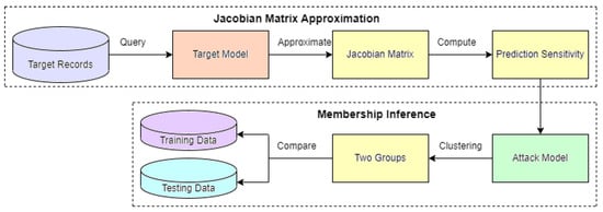 The idea behind this attack is that training data from a fully trained ML model generally have lower prediction sensitivity than untrained data (i.e., test data). The overview of this attack [11] is shown in Figure 2. The only allowed interaction between the attacker and the target model M is to query M with a sample x and then obtain the prediction result. The target model M maps the n-dimensional vector to the output m-dimensional . The Jacobian matrix of M is a matrix whose element in the ith row and jth column is and :