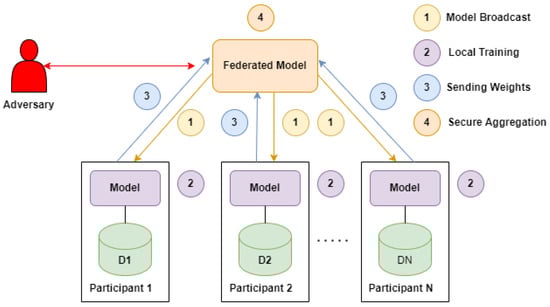 For training, we used SGD, RMSProp, Adagrad, Nadam, and Adadelta optimizers, with a learning rate equal to 0.01. The loss function for all the optimizers is the categorical cross-entropy. We have a batch size of 32 and epochs of 10 for each participant during training. We reproduced the FL process, including local participant training and FedAvg aggregation. The scheme of data flow is illustrated in Figure 3.