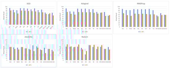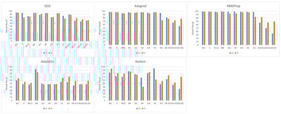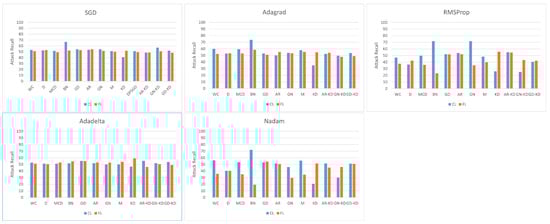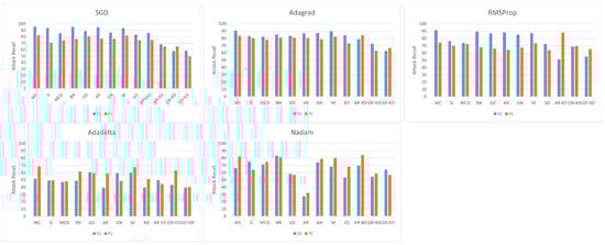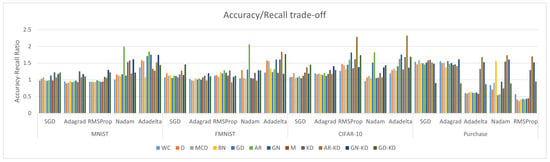 To obtain a clear comparison between the efficiency of the countermeasures, we calculated the ratio of accuracy over recall. The higher the ratio is, the better the trade-off we are achieving. Figure 14 illustrates the accuracy–recall ratio of each countermeasure. As shown in Figure 14, for almost all optimizers, the highest trade-off belongs to one of the combinatory approaches (either AR–KD, GN–KD, or GD–KD). This figure proves that the combinational approaches that we tested provide a better trade-off between the accuracy of the target model and MIA attack recall. The higher value of this trade-off conveys the message that the mitigation technique keeps the accuracy of the target model high and reduces the attack recall as much as possible.