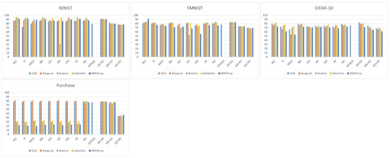 A comparison of FL model accuracy with five various optimizers, with and without countermeasures—MNIST, FMNIST, CIFAR-10, and Purchase datasets.