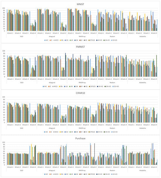 - FL model accuracy with countermeasures: As per Table 4, BN has no significant effect on the CIFAR-10 model accuracy. For CIFAR-10, the highest accuracy belongs to AR–KD when using the SGD optimizer, and the lowest accuracy belongs to MCD when using the Adagrad optimizer. For MNIST and FMNIST, the countermeasure that maintains the maximum accuracy varies between different optimizers. For instance, in FMNIST, the mitigation technique that keeps the model accuracy at its maximum value is AR–KD for four optimizers: SGD, Adagrad, RMSProp, and Adadelta. Also, for Nadam, KD yields the highest accuracy in the FL environment. For FMNIST, the lowest accuracy belongs to AR when using the Nadam optimizer. For MNIST, the best accuracy goes for AR–KD when using SGD and Adagrad, whereas M provides the highest accuracy in RMSProp and Nadam. Also, BN provides the highest accuracy when using Adadelta. The lowest accuracy for MNIST belongs to GD–KD when using the Nadam optimizer. The highest accuracy for the Purchase dataset belongs to AR when using SGD and Adagrad, as well as KD when using Nadam and Adadelta.