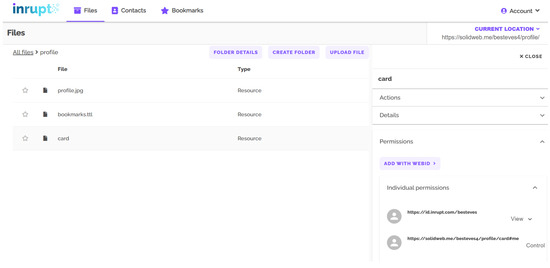 Both options—access provided at the time of starting to use the app or pre-set authorizations—can take various forms, depending on the technical access control mechanism that is implemented in the server where the Pod is hosted, as the servers are not obliged to implement both authorization protocols (WAC and ACP) promoted by Solid, as was previously discussed in Section 2.2, and on the interfaces used to interact and manage the data and the access grants stored in the Pod.