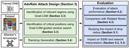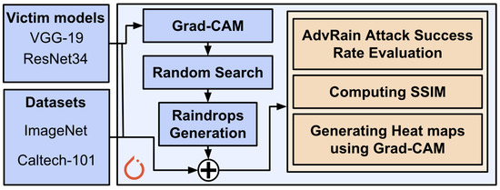 For our evaluations, we utilized images from two well-known datasets: ImageNet and Caltech-101 [27]. ImageNet [28] is a large visual dataset containing over 14 million annotated images, organized into more than 20,000 categories. On the other hand, Caltech-101 consists of images depicting objects from 101 distinct classes, with approximately 9000 images in total. Each class contains a varying number of images, ranging from 40 to 800, and the images have variable sizes with typical edge lengths of 200–300 pixels. Throughout our experiments, we established the baseline classification accuracy of the models by evaluating their performance when fed with clean, unaltered images. By simulating different sizes of raindrops and studying their effects on model classification accuracy, we gained valuable insights into the robustness of the models under adversarial perturbations. The comparison to the baseline classification accuracy allowed us to quantitatively assess the effectiveness of our AdvRain attack and its ability to deceive the models while introducing minimal visual changes to the images. The experimental setup is summarized in Figure 7.