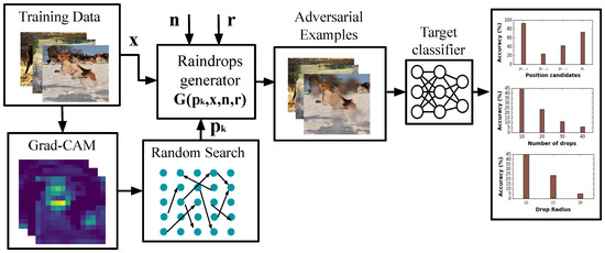 where G is the raindrop generator, p stands for the drops positions, n for number of drops, r for the drop radius. Technically, considering a 2D image x with denoting the pixel at the location. Our aim is to find the best position candidate for the n raindrops, in a way that the model wrongly classifies the generated adversarial example.