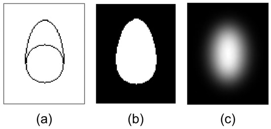 Raindrop generation process: (a) The raindrop shape is formed using one circle and one oval. (b) The final shape. (c) We then create the effect of the water droplet surface through adding the blur effect.