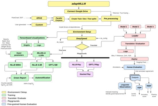 Overview of adaptMLLM. Key areas include initialisation, menu of operation modes, loading and pre-processing, MLLM fine-tuning, visualisation, deployment, a green report, MLLM translation and evaluation, LLM playgrounds and human evaluation (cf. Section 4).
