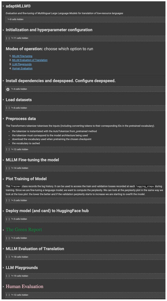 Unlike many translation toolkits, our application does not use a command line interface. Instead, we have designed and fully implemented the interface in Google Colab, (https://colab.research.google.com, accessed on 22 November 2023) a cloud-hosted solution (https://cloud.google.com, accessed on 22 November 2023) that is more intuitive for both educational and research settings. Furthermore, our application provides Graphical User Interface (GUI) controls within adaptMLLM, enabling users to customise all key hyperparameters required for MLLMs.