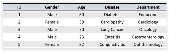 Motivation. SE allows data users to retrieve encrypted documents that are stored on cloud servers by utilizing an encrypted token without decrypting the documents. Thus far, most SE schemes support either multi-keywords search [1,2,3] or range search [4,5,6]. But, in a medical system, data users will perform a query containing both digital and textual fields. For an electronic medical record [7], it may contain both digital values and keywords. As shown in Figure 1, age and ID are numeric fields, while gender, disease, and department are keyword fields. Moreover, the user’s query also contains both range and keywords content, e.g., age ∈ [18, 45] AND disease ∈ (diabetes, enteritis). If an SE scheme supporting only keyword search or range search is used to implement searching over encrypted EMR data, two EMR systems will be maintained: one that contains only text fields, and the other that contains only numeric fields. This not only increases the time and space complexities of the search process, but also reveals more intermediate information. Considering such an actual demand, it is necessary to build a SE scheme that can support range and keyword searches simultaneously.