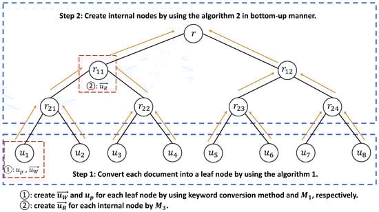 Inspired by the index tree construction algorithm in [28,38], the approach for constructing the index tree is given in Algorithm 2. contains a set of nodes. Each node in does not have a parent node and is needed to be processed. The overall idea of the algorithm is to construct an internal node using every two nodes in until there is only one node left in , which means that this unique node is the root of the tree. Specifically, suppose and are any two nodes in , then their parent node u is created as follows. First, let and point to nodes and , respectively, and generate unique ID for u with ; then, by taking advantage of , create based on the range vectors of and ; and finally, add u to . Note that, if is odd, the last node in will be inserted to directly. When the parents of all nodes in have been created and added to , Algorithm 2 will be called recursively with as the input until the index tree is constructed.