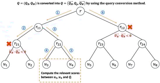 In this example, we suppose that only the top-1 file will be returned to the data user, and Figure 4 was constructed to show the index tree search process. When using the query transformation approach, a query is converted into a tuple . According to the index tree shown in Figure 3, the search algorithm starts from the root node r and reaches the internal node first. Since the inner product between the of and of Q was larger than 0, the search algorithm accessed its child nodes. Because the inner product between the of and of Q was smaller than 0, then the two child nodes and of will not be reached. Since the node matches the query Q, Algorithm 3 computes the relevant scores between and Q, as well as adds to directly since the number of documents in the had not reached the upper limit. When reaching , Algorithm 3 computes the relevant score between and Q, as well as compares this score to the k-score. If the relevant score between and Q is larger than the k-score, Algorithm 3 deletes from and adds to instead; otherwise, nothing happens. When the left subtree is checked, Algorithm 3 will detect node . Since the query Q was not related to the node , the subtree with as the root node would not be accessed. After this, Algorithm 3 output . Numbers 1–6 in Figure 4 illustrate the tree traversal process. It can be seen that subtrees with or as the tree root will not be visited. This pruning improves the query efficiency of the scheme.