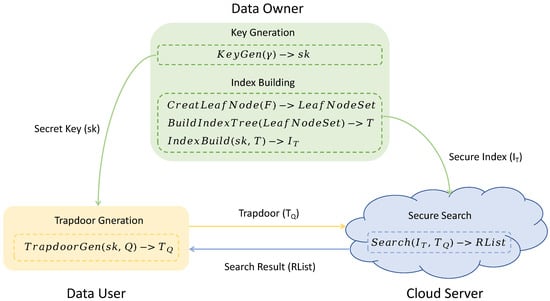 As shown in Figure 2, similar with most SSE schemes [12,13,14,15,16], the system model of SSE-KR consists of three different roles: data owner (DO), data user (DU), and cloud server (CS). For SSE-RK, four main protocols are included: key generation, index building, trapdoor generation, and secure search. Specifically, the responsibility of the DO is to encrypt all documents, build secure indexes, and send them to a CS. The responsibility of the DU is to issue queries, i.e., generate secure trapdoors, and to send them to a CS. The CS is responsible for performing the secure search and returning the query results to the DU.