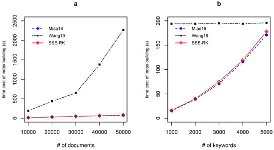 To sum up, as shown in Figure 6, the time cost of index building in Wang19 is much longer than that of Miao18 and the proposed scheme because its encryption process requires enumerating all points in the range associated with the internal node, and the SHVE encryption operation it uses is more time-consuming than the product operation. In addition, the time cost of index building in the SSE-RK scheme is slightly more than that of Miao18 because the proposed scheme needs to encrypt d internal nodes.