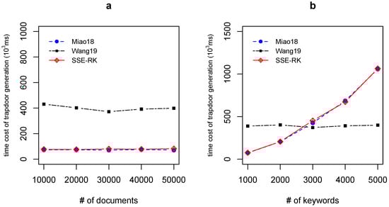 According to Figure 7a, it can be seen that all schemes are independent of d. Furthermore, the proposed scheme requires slightly more trapdoor generation time compared to Miao18. And the time cost of trapdoor generation in Wang19 is more than that of the other two schemes. This result could be explained by the fact that the time consumption of the key generation algorithm of SHVE used in Wang19 is more than that of the product operation in Miao18 and our scheme. In addition, according to Figure 7b, it can be seen that both Miao18 and the proposed scheme are squared with N, while Wang19 is independent of N. As N keeps increasing, the time cost of trapdoor generation in Miao18 and the SSE-RK scheme will be higher than that of Wang19.