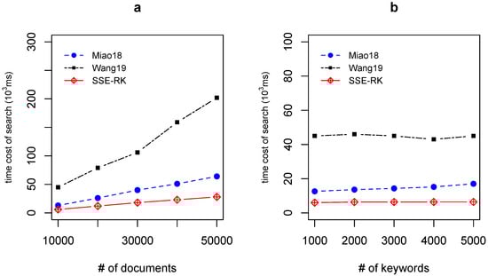 The results in Figure 8 corroborate the above analysis. As shown in Figure 8a, the proposed scheme has a sub-linear relationship with d as d increases. Compared with Miao18, the test time of the proposed scheme is lower since the proposed scheme utilizes the tree structure to reduce the access of a large number of irrelevant documents, thus making much smaller than d. Although both Wang19 and our scheme utilize the tree structure to improve the query efficiency, the search efficiency of the SSE-RK scheme is preferable to that of Wang19 since the decryption operation of SHVE is more time-consuming than the product operation. According to Figure 8b, the query time of Wang19 is independent of N, while that of Miao18 and our scheme grows slightly as N increases. Since the decryption operation of SHVE used by Wang19 is more time-consuming than the product operation, its query efficiency is still the lowest.