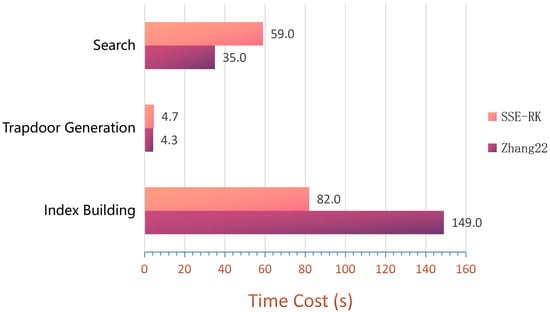 Most of the existing SSE schemes only support keyword search. Compared to these schemes, the proposed scheme can support more complex query conditions. In order to quantify the cost of enhanced query functionality, we chose a highly efficient SSE scheme that only supports keyword search for an experimental comparison. We denote this scheme Zhang22 [38], and we show the experimental results in Figure 9. The experimental data show that the proposed scheme has an advantage in terms of index building time. This is because the internal nodes of the index tree of SSE-RK are constructed using range data, while that of Zhang22 are created using keyword vectors. Thus, the time complexity of the index tree building of SSE-RK is , while that of Zhang22 is . The trapdoor generation time for the proposed scheme is a little higher than the one for Zhang22. This is because the trapdoor for SSE-RK will include range information in addition to keyword information. The search time for the proposed scheme is somewhat higher than the search time for Zhang22. This is because the query process of SSE-RK not only involves the similarity calculation of the keyword vectors, but also the determination of whether the ranges overlap. Zhang22, on the contrary, only needs to perform the similarity calculation of the keyword vectors. Therefore, the search time complexity of the proposed scheme is , while that of Zhang22 is N. The experiment results illustrate that the proposed scheme does incur a certain query cost when implementing more complex query conditions. Therefore, meaningful future work could be to improve the search efficiency of the scheme.