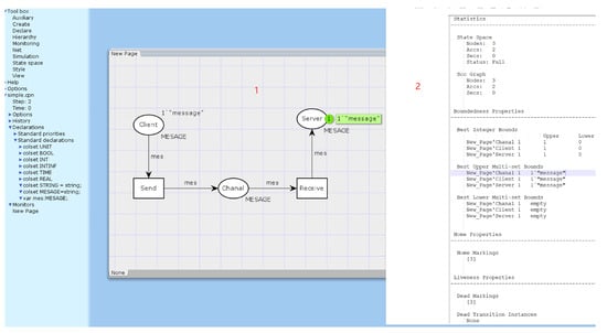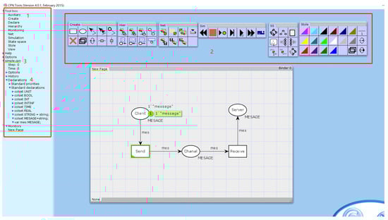Let us introduce CPN with a simple visual example: In Figure 2, the red number 1 indicates the toolbox, the red number 2 indicates the function of the specific toolbar, the red number 3 indicates the model running steps and time, and the red number 4 is the area where variables and functions are defined in the CPN ML language.