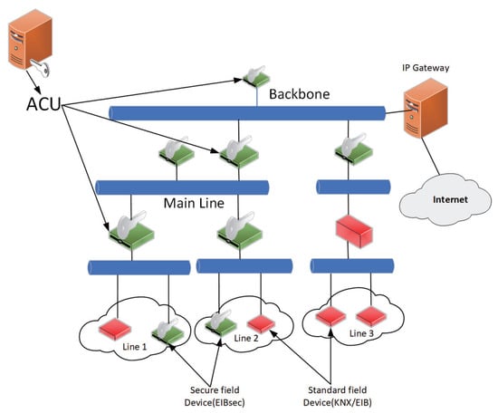 As shown in Figure 4, The topology diagram of the EIBsec protocol is presented in a tree structure, mainly divided into three layers: backbone layer, mainline layer, and line layer. Each layer has an Advanced Coupler Unit (ACU) [] at least, which is mainly used for distributing session keys or group keys. The backbone layer is connected to the internet through a gateway, the mainline layer is connected to the line layer through ACU, and the line layer implements specific data transmission services. ACU is similar to standard KNX/EIB lines [] or backbone couplers [], which allows ACU to be compatible with KNX/EIB network traffic and handle data requests from different network segments. Moreover, this tree structure is beneficial for avoiding the occurrence of single-point failures and can also help minimize the consequences of DoS attacks. For example, when an ACU detects a DoS attack on its network segment, it will be able to isolate the affected network segment and prevent attackers from accessing the rest of the network.