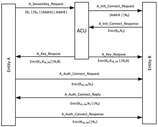 Step 3: Entity B responds to ACU with an encrypted message based on the connection request content, which contains a random number N2 and is encrypted using Entity B’s key KB.