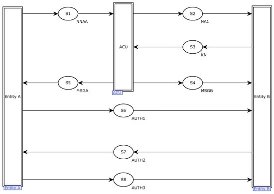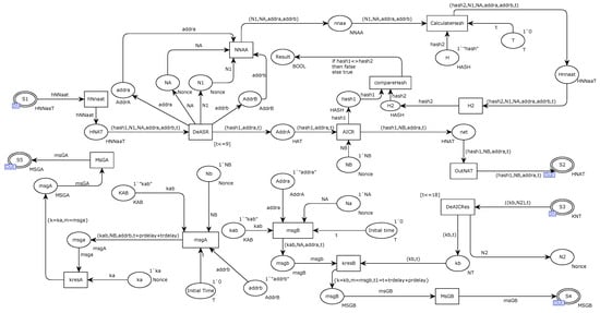 Place S3 receives the response message KN from entity B, which is a combination of kb and N2. At this time, ACU obtains the keys ka and kb generated by entity A and entity B, respectively. Finally, MSGA and MSGB are sent to Entity A and Entity B, respectively, through output places S4 and S5. Both messages contain the session key kab and carry random numbers NB and NA, respectively. At the same time, the messages are encrypted and transmitted using the keys ka and kb generated by each.