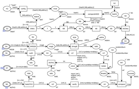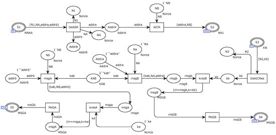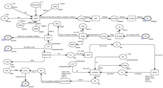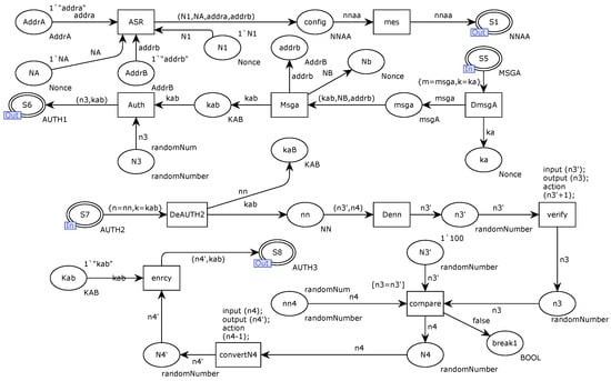 Figure 7 shows the internal CPN model of entity A’s substitution transition. Firstly, Entity A sends a session key request nnaa message to the key distribution server ACU through the message store place S1. The message nnaa is composed of random numbers NA, N1, addra, and addrb. Place S5 receives the MSGA message sent by the key server ACU. The MSGA message is encrypted by ka, decrypted at the transition DmsgA to obtain the session key kab, and stored in the kab place. Transition Auth combines the session key kab and the random number N3 into an AUTH1 identity authentication request message, sends it to the S6 message storage place, and sends it to entity B through the S6 place.