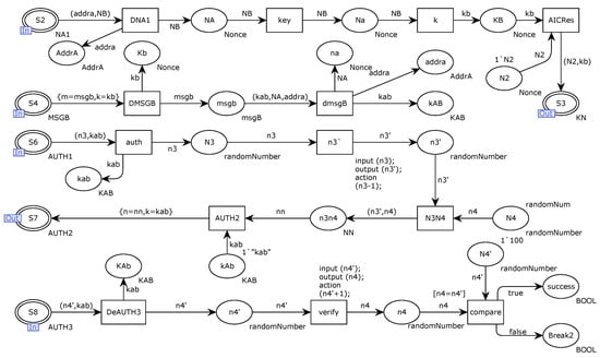 Figure 8 shows the internal CPN model of the key distribution server ACU substitution transition. After receiving the request message from entity A through the S1 place, AUC splits the message NNAA according to the splitting principle and learns the entity object that entity A wants to establish a session connection. Subsequently, the ACU combines the request message (addra, NB) through the transition AICR. This message is composed of addra and the random number NB, and NB is generated by the ACU.