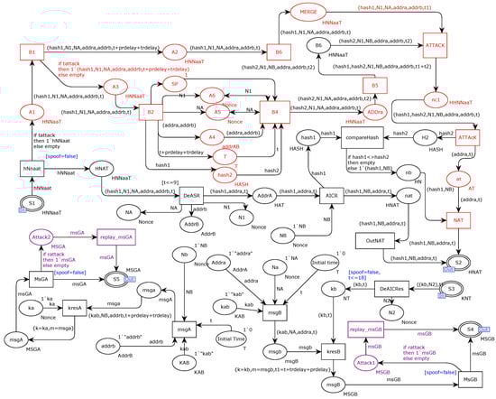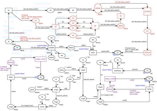 In Section 5.2 we strengthen the security mechanism of the protocol by adding timestamps and hashes to the CPN model of the original protocol. As shown in Figure 16, in this section, we will introduce the same Dolev–Yao adversary evaluation model into the improved new scheme CPN model to attack our improved model. The evaluation model still includes three types of man-in-the-middle attacks: tampering attacks, replay attacks, and spoofing attacks. The attacker launches the attack at the key distribution server ACU, as shown in Figure 11. The red part represents a tampering attack, the purple part represents a replay attack, and the blue part represents a spoofing attack.