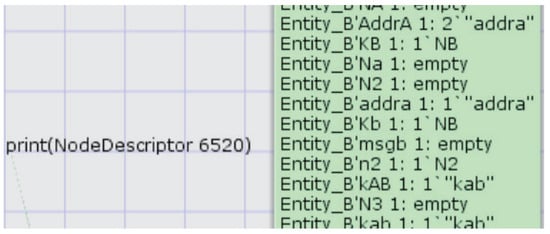 Figure 9 describes the internal CPN model of the substitution transition entity B. After receiving the request message sent by the ACU through S2, entity B learns the entity object that wants to establish a session connection. Entity B receives the MSGB message through S4, the transition DMSGB to use the key kb to decrypt, and it obtains the session key kab and the random number N2 generated by itself. If N2 is met as expected, it means that the session key is obtained by the expected key server distribution.