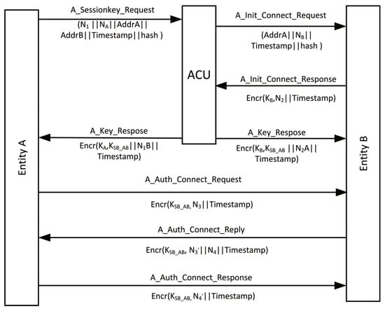 Step 4: After receiving the response message from entity B, ACU decrypts the response message and then responds to entity A and entity B with a message containing the session key. The message responding to entity A contains the session key KSB_AB and Random number NB of entity B, Using KA to encrypt messages containing KSB_AB and NB. The message responding to entity B contains the session key KSB_AB and Random number NA of entity A, Using KA to encrypt messages containing KSB_AB and NA. After this step is completed, it indicates that ACU has completed key distribution, followed by entity A and entity B for identity authentication.