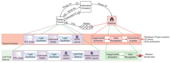 To meet the large operational, maintenance, and development costs, the semiconductor industries are inclining towards a fabless business model, i.e., outsourcing the fabrication to offshore foundries. Such outsourcing has also led to other benefits of outsourcing the Integrated Circuit (IC) fabrication and adopting a global supply chain for reduced capital and maintenance costs, minimized design-flow efforts, and time-to-market [1,2]. Despite the achieved benefits, such outsourcing and adoption led to a complex verification and fabrication cycle, and supply-chain increased possible hardware threat space, arising in different forms, namely IC piracy, overproduction, hardware Trojan (HT) insertion, and reverse engineering [3,4,5].