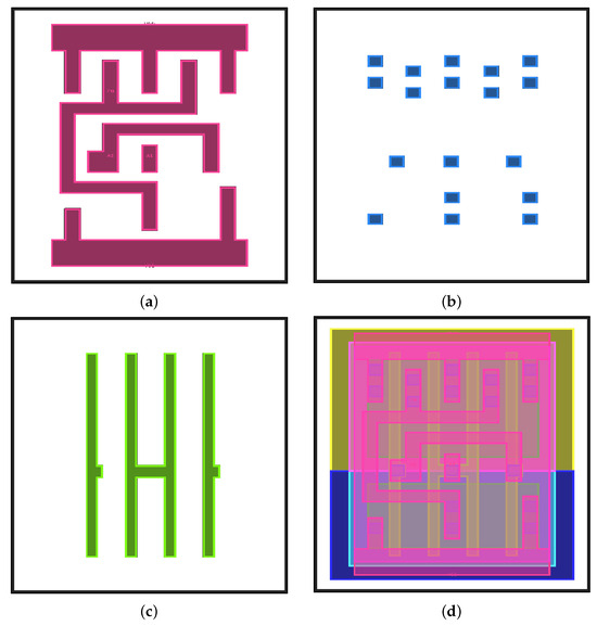 An example of different layers of a 2-input NAND gate. (a) Metal 1 layer, (b) Contact layer, (c) Poly layer, (d) All layers.
