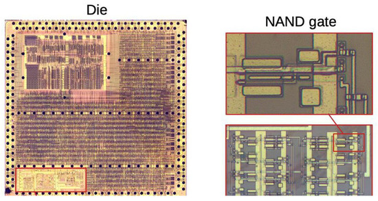 An example of fabricated IC, with a sample of NAND gate inside it.