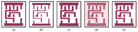 Impact of different morphological transformation operations on a metal layer. (a) Original, (b) Impact of “Erosion”, (c) Impact of “Dilation”, (d) Impact of “Close”, (e) Impact of morphing.