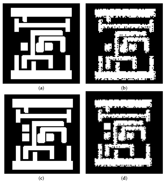 Impact of different morphological transformation operations on a metal layer. (a) Original image, (b) Morphed image, (c) DRC-compliant perturbation added to noise-free image, (d) DRC-compliant perturbation added to the morphed image.