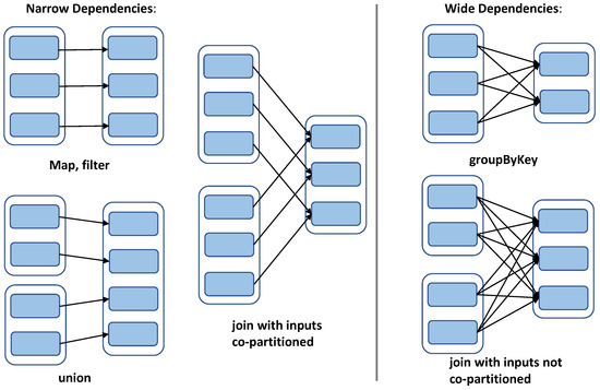 There are two kinds of RDD operations in Spark: namely, transformation operations and action operations. The transformation operations refer to the operation of creating a new RDD from the existing RDD and returning the new RDD. The transformation operations are lazily evaluated. They do not immediately trigger the execution of the actual conversion and only records the conversion relationship between RDDs. Only when an action operation is triggered can the transformation operations be truly executed and the calculation result be returned. Spark submits the operator graph to the DAGScheduler when an action operation is called. DAGScheduler divides DAG into stages according to wide dependencies. The dependencies between RDDs can be divided into narrow dependencies and wide dependencies, as shown in Figure 2. Narrow dependencies mean that a partition of each parent RDD is used by at most one partition of the child RDD. Wide dependencies mean that each partition of the parent RDD can be used by multiple partitions of the child RDD, which are also known as shuffle dependencies.