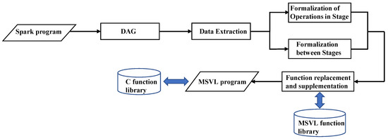 In Algorithm 4, is the number of stages. stores the operation names and anonymous functions for each stage after formalization. stores the formalization of operations in each stage. stores formalization between stages. The array para stores the parallelism of all stages. The format method is used to format strings. We process the formalized operations in each stage (Lines 1–2). If this operation is , we add it to the array , which records the processed operations. Then, we check the number of times the operation has already occurred, change the MSVL function corresponding to the operation based on the number of occurrences, and replace the operation in the formalization of operations of this stage (Lines 3–8). If this operation is , the is added to the array and the number of occurrences is recorded. Then, we perform parallel processing on the corresponding MSVL function based on the parallelism of this stage, replacing the operation with parallelized MSVL function in the formalization of operations of this stage (Lines 9–21). After formalizing a stage, we add the corresponding shuffle function based on the wide dependency operation of the next stage connected to it (Lines 24–26), and we replace the corresponding stage in the formalization of the stage with the formal operations of this stage after processing (Line 27).