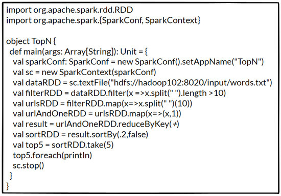 The aim of this case study is to analyze clickstream log data using Spark and find the top five URLs with the most visits. Figure 4 displays the Scala code for the TopN application.