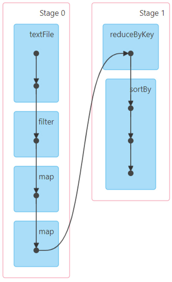 We first extract the formalization of RDD operations within stages and the formalization between stages according to the DAG. To execute the application, we built a Spark cluster environment and obtained the DAG of the application, which is shown in Figure 5. This figure illustrates how Spark executes the application, where each blue rectangle in the stage represents an RDD generated by an association operation and arrows indicate the relationships between RDDs.