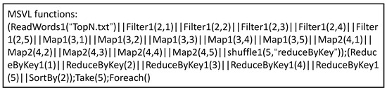 The parallelism depends on the default configuration of the Spark framework. In our simulated environment, the number of cores is set to five. Therefore, we configure the parallelism of the functions Filter, Map1, Map2 and ReduceByKey1 to be 5, meaning that each of them can process five data pieces in parallel. Map1 and Map2 distinguish between two different execution logics. For instance, Map1 is used to process (_*2), while Map2 is used to process (_2). Since the take and foreach operations are not displayed in the DAG, they are handled specifically through Algorithm 5 and added to the translated MSVL program.