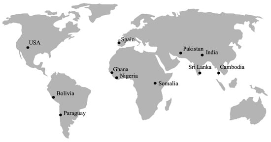 The dataset employed in this research [16] comprises 446 images from Sentinel-1 and 446 images from Sentinel-2 satellites, both integral components of the European Space Agency’s Copernicus program, which is facilitating open access to satellite data. This dataset encompasses imagery from 11 distinct global flood events, occurring in Bolivia, Ghana, India, Cambodia, Nigeria, Pakistan, Paraguay, Somalia, Spain, Sri Lanka, and the USA, as depicted in Figure 1.