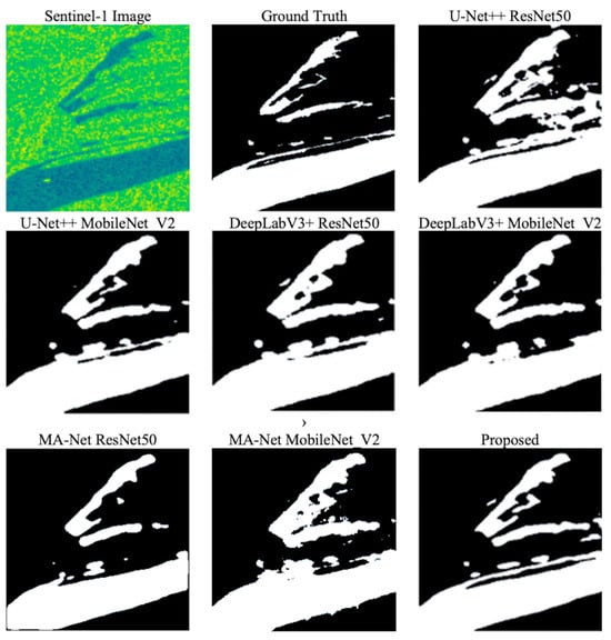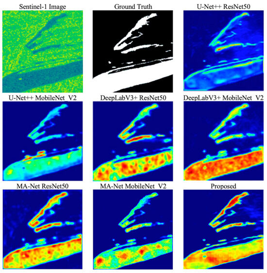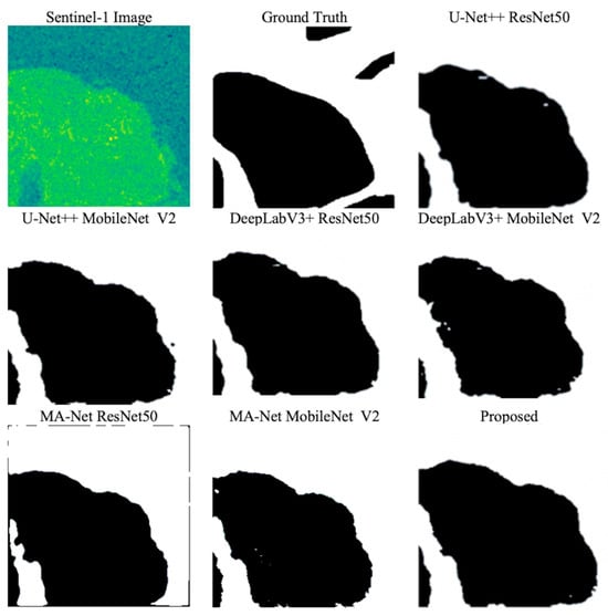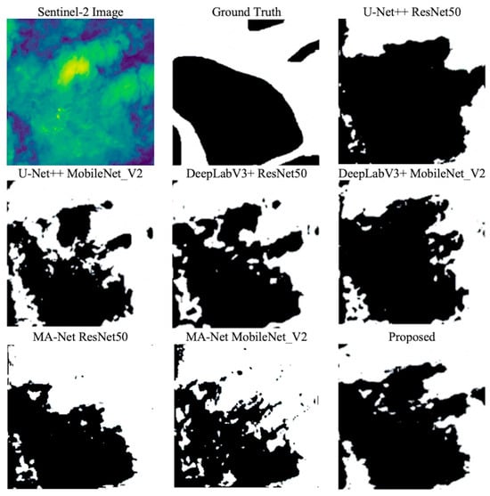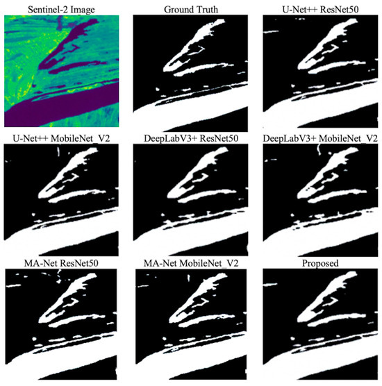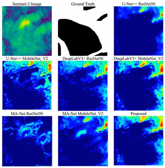 Table 6, Table 7 and Table 8 show the mean accuracy, loss, F1 Score, and IOU during the training, validation, and testing of the models trained with Sentinel-2 images, where the superiority of the proposed model was further emphasized. Of the state-of-the-art models, U-Net++ with ResNet50 was the best performing with Sentinel-1 images; however, with Sentinel-2 images U-Net++ with MobileNet_V2 exhibits superior performance, suggesting that each state-of-the-art model is better suited to a particular data type. The proposed model, however, outperformed each of the state-of-the-art models across both image types. This demonstrates its ability to adapt to both SAR and optical image sources, further reinforcing its suitability for practical applications, as it will provide consistently high performance regardless of available data.