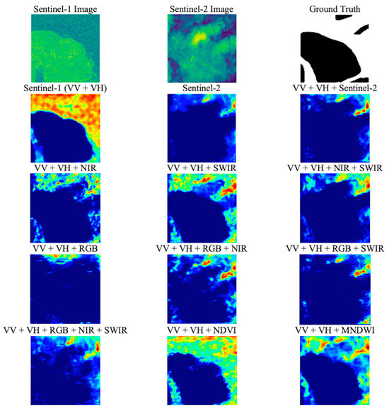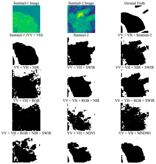 In Table 11, Table 12 and Table 13 the accuracy, loss, F1 score, and IOU are shown for the proposed model when trained with Sentinel-1, Sentinel-2, and each fusion–configuration of the two satellite image types. It is evident from these tables that in most cases, the fusion of Sentinel-1 and Sentinel-2 bands improved the performance over Sentinel-1 alone but were not able to surpass the performance of Sentinel-2 alone. During training, the only exception to this was where Sentinel-1 was fused with the RGB bands of Sentinel-2, where the performance was weaker than for Sentinel-1 alone. During validation and testing, the fusion of Sentinel-1 with both NDVI and MNDWI also underperformed in comparison to Sentinel-1 alone, which given their superior performance in training suggests potential overfitting and lack of ability to generalize to unseen data. Moreover, the fusion of Sentinel-1 with the RGB, NIR, and SWIR bands of Sentinel-2 provided performance comparable to that of Sentinel-2 alone, and in some cases, such as the training loss and testing IOU was able to outperform Sentinel-2.