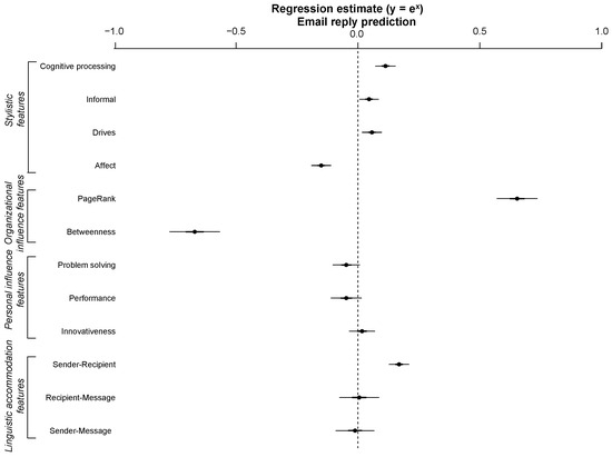 - Contribution analysis: To address RQ1a and RQ1b, we explored the association of individual measures with reply prediction by fitting quasibinomial generalized linear models to our dataset after standardization and feature selection and visualizing the feature importance in terms of the magnitude of the coefficients in the final fitted model.